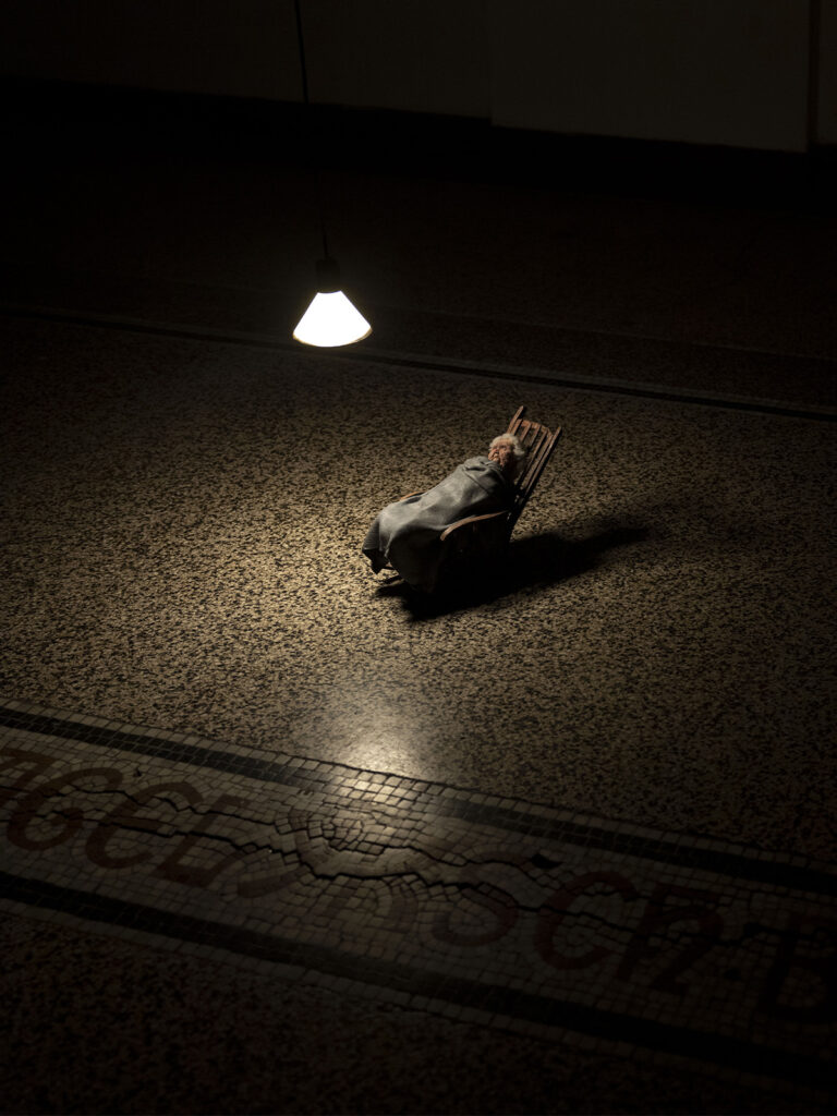 La scultura di questa nonna, che riposa serena ma dal cui interno proviene l’audio di una tempesta che rimbomba in tutta la stanza, vuole in qualche modo raccontare di come l’esterno sia dentro di noi. La mia intenzione in questa piccola scultura vuole tendere a suggerire il sentire di un ricordo antico, una presenza che ha dominato le nostre vite molto più a lungo di quanto non lo stia facendo il vivere contemporaneo. Abbiamo costruito un tetto per proteggerci dalla pioggia, il che non vuol dire che di colpo abbia smesso di piovere.