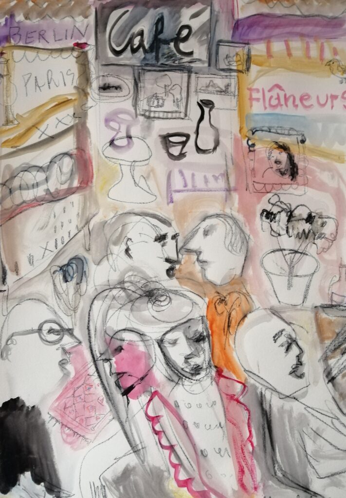 Giampaolo Nuvolati, Flâneurs a Parigi, 2025, disegno acrilico e matita su cartoncino 50x70