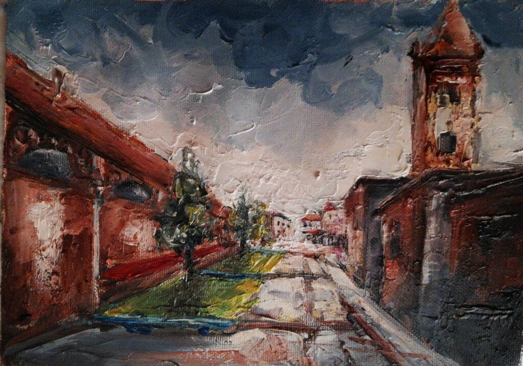Dipinto a olio di Angelo Ariti del contesto urbano alla base del progetto di riuso degli ex frigoriferi militari di Cuneo