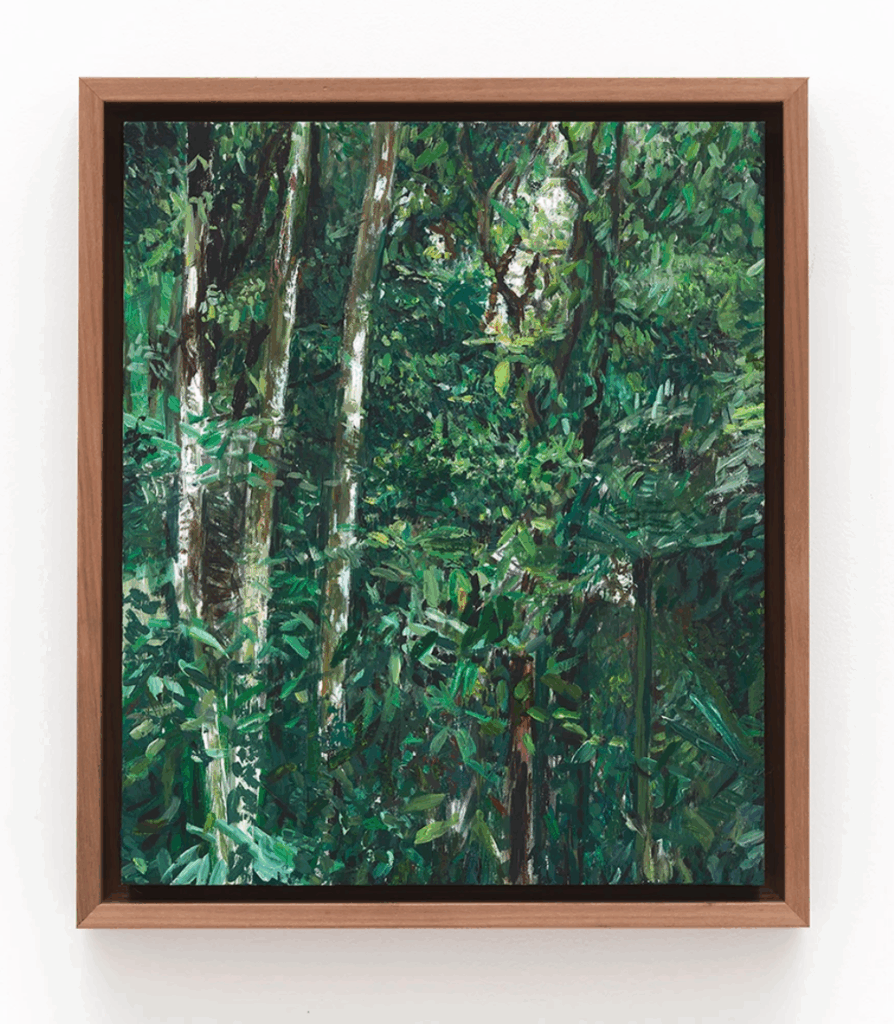 Le foreste in cui Mellin dipinge sono quelle in cui sono attivi i progetti di protezione di Art into Acres, che può essere definito come una sorta di collettivo ambientale per preservare vaste aree di territorio incontaminato. La comunità artistica globale partecipa attraverso la donazione e la vendita di opere d’arte, il cui ricavato va a sostegno della protezione delle foreste (30 milioni di ettari fino a oggi), restituendole alle comunità locali e indigene e coinvolgendo organizzazioni internazionali. Un movimento vastissimo, nato da Haley Mellin come pratica artistica che pone al centro la comunità. “I territori protetti si trovano di norma in luoghi dalla forte biodiversità, molto spesso ai tropici. Per otto milioni di anni, vicino all’Equatore, le foreste tropicali si sono sviluppate generando un’alta biodiversità, grazie al clima stabile” spiega l’artista. Tra le aree di intervento di Art into Acres vi sono riserve e foreste in Brasile, Bolivia, Cile, Colombia, Equador, Perù, Suriname. Tra i progetti portati recentemente a compimento, c’è l’istituzione nell’ottobre 2024 del primo territorio per popoli indigeni in isolamento a Putumayo in Colombia, che tutela un milione di ettari di foresta amazzonica; un caso in cui, insieme alla biodiversità, sono stati protetti anche i diritti culturali delle popolazioni originarie. Ma Art into Acres lavora anche a latitudini più alte: sempre nel 2024, in Canada, è stata istituita nello Yukon la nuova area di conservazione di 850.000 ettari di Aullaviat/Anguniarvik sotto la guida delle comunità indigene Inuvialuit.